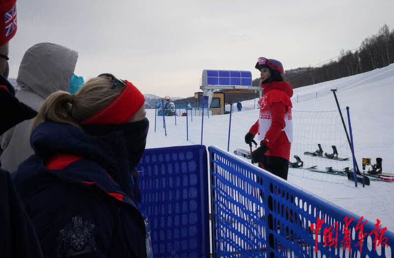 2月17日,北京2022年冬奥会张家口赛区,自由式滑雪女子U型场地技巧资格赛上,第一轮比赛结束后,谷爱凌在赛道边观赛,为场上的选手加油助威。中青报·中青网记者 李峥苨/摄