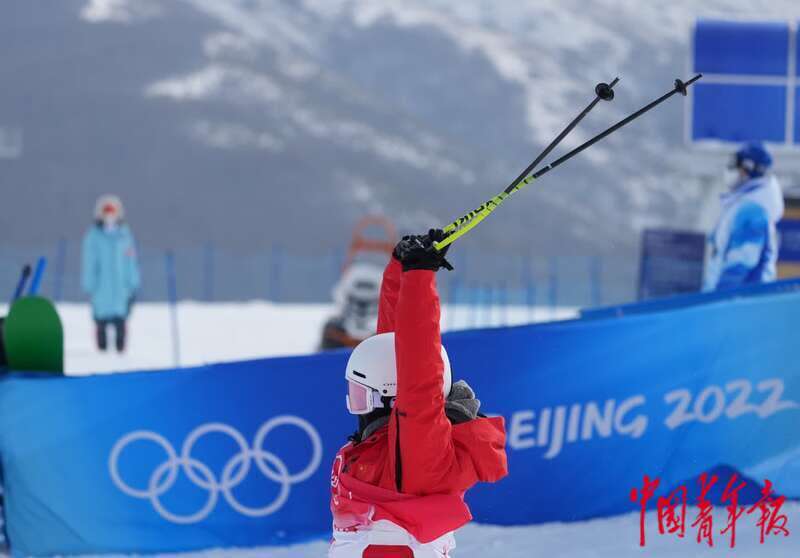 2月17日,北京2022年冬奥会张家口赛区,自由式滑雪女子U型场地技巧资格赛上,李芳慧第二跳后举起手仗。中青报·中青网记者 李峥苨/摄
