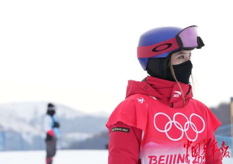 2月17日,北京2022年冬奥会张家口赛区,自由式滑雪女子U型场地技巧资格赛上,谷爱凌在赛前试滑。中青报·中青网记者 李峥苨/摄
