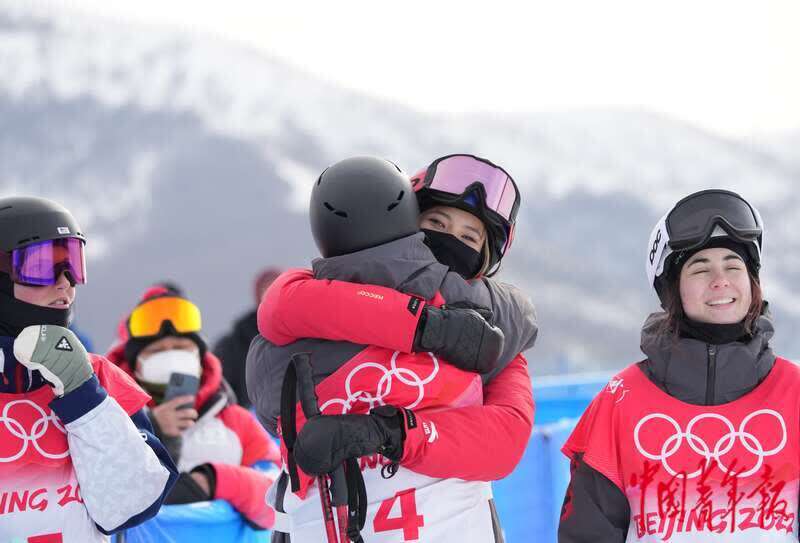2月17日,北京2022年冬奥会张家口赛区,自由式滑雪女子U型场地技巧资格赛上,谷爱凌与加拿大老将卡西·夏普拥抱。中青报·中青网记者 李峥苨/摄