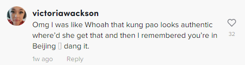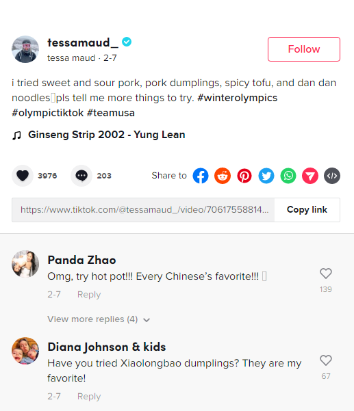 “我吃过糖醋里脊、猪肉饺子、麻婆豆腐和担担面。请告诉我更多可以尝试的美食,”她在Tiktok上问道。粉丝们立刻在评论区列出了一系列人气中国菜。