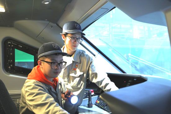 乌鲁木齐车辆段职工郭子奇和吴敖龙在司机室检查动车组状态,确保各部状态良好。张学敏/摄