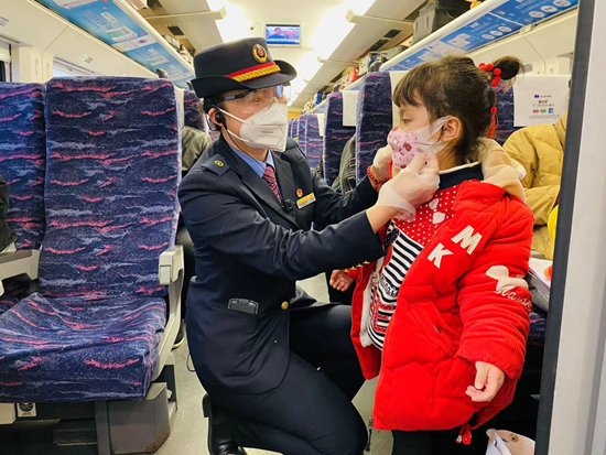 作为交通运输系统、出行领域2022年的开年大考,虎年春运不仅事关广大人民群众切身利益,也面临着疫情防控等考验。D2198次列车上,武汉客运段列车员李宜蓉在帮助小旅客规范佩戴口罩。杜瑞婷/摄