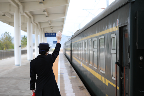 听到出发汽笛,客运员范林亚挥手向驾驶室里的丈夫陈振巍道别。因为工作性质、时间不同,春运期间她和丈夫聚少离多,见面最多的地方就是长汀南火车站的站台。陈国俊/摄
