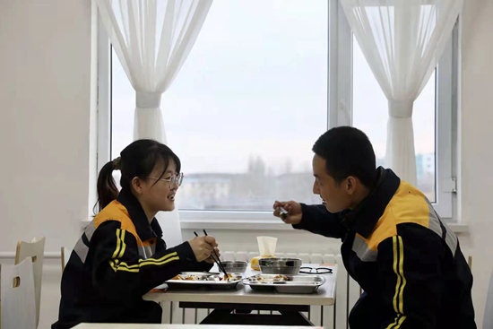 春运期间,榆林车辆段做好陕北地区铁路货车的检修和破损车整修工作,为浩吉、包西等煤运大通道提供车辆保障。图为坚守岗位的榆林车辆段职工石卯、郑甜丽夫妇在职工食堂就餐。师润润/摄