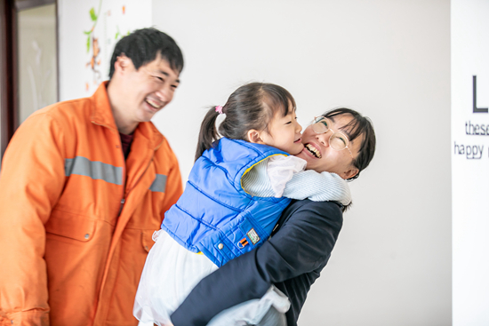 上班前,女儿糖糖抱住妈妈,告诉妈妈记得要早点回家。春运期间,糖糖的母亲综控员刘淼负责赣州西站12块液晶屏上的254幅监控画面,8块客运作业屏,工作之余通过家中的监控看看女儿的情况。邹阳/摄