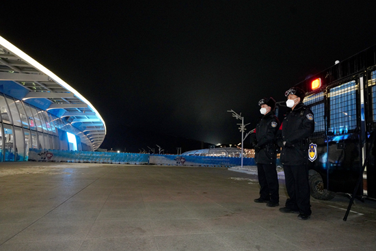 元宵节当晚,参加2022年北京冬奥会安保工作的铁路公安民警坚守在太子城站执勤岗位。焦维凯/摄