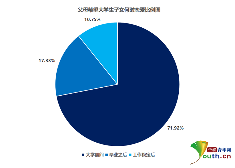 何媛母亲的想法不是个例,根据中国青年网数据调查显示,71.92%的父母认为子女最佳恋爱阶段为大学,55.76%的受访大学生也表示自己理想的恋爱时期是大学。