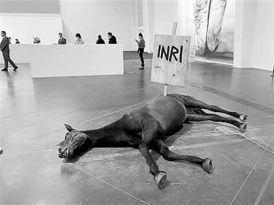 展签介绍说,卡特兰的这件作品是受动物保护组织的启发,他们常常把自己装扮成动物的模样躺在地上,抗议人们对动物的杀戮。因为“INRI”,这匹马俨然成了受害者和殉道士的象征。而在反智逆流蔚然成为时代洪流的当下,我在这匹马身上看到的,是智者的命运——他们在大众狂欢的舆论场被杠到无话可说,被狙到无处藏身。想帮助和救赎世人的人,却被置之“死地”,“死”之前还会被百般羞辱。