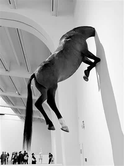 胶带绑香蕉虽是卡特兰最出圈的作品,但展厅里最夺人眼目摄人魂魄的,是三匹马——一个倒地不起、一个高高挂起、一个猛冲入墙,看得人脑瓜子嗡嗡的……