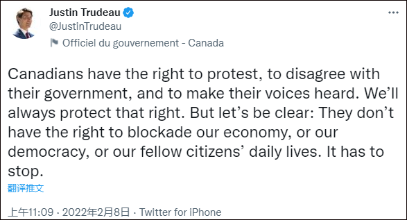 2月8日,他在推特发文称:“加拿大人有权抗议、不同意政府并表达他们的声音,我们将永远保护这一权利。但让我们明确一点:他们无权封锁我们的经济、民主或同胞的日常生活。这一切必须停止。”