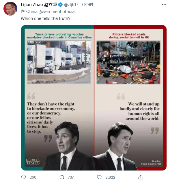 “究竟哪个特鲁多说了真话?”在发布上述由《环球时报》制作的对比图后,赵立坚在推特如此问道。