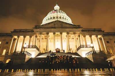2月7日,美国首都华盛顿,议员们在国会大厦外的台阶上进行默哀仪式,悼念90万名因新冠肺炎疫情去世的美国人。新华社/路透