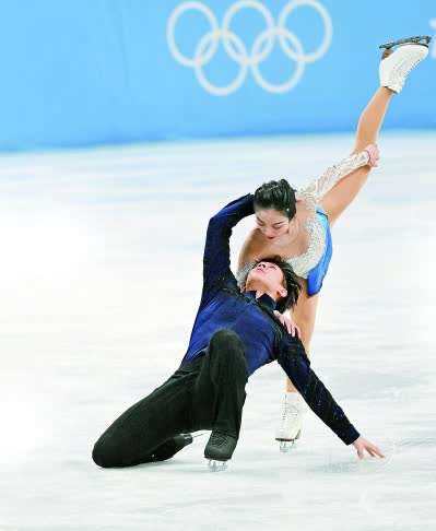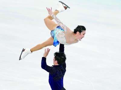 2月19日,北京2022年冬奥会花样滑冰双人滑自由滑比赛在首都体育馆举行,中国选手隋文静/韩聪夺得双人滑冠军。图为隋文静(上)/韩聪在比赛中。光明日报记者 郭红松摄/光明图片