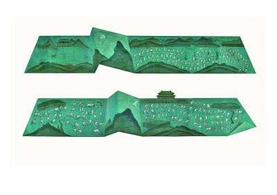 同样是表现冬奥,艺术家任慧慧则将创作视角聚焦在了古今冰雪运动的发展演变上。她以套色木刻的语言形式分别描绘了清代“冰嬉”与现代冰雪运动的景象。在上下并置的两幅折叠的长卷之上,不同时代的冰雪运动虽场地不同、装备不同、规则不同,但相同的是那份奋勇拼搏、力争上游的劲头。在谈到创作体会时,任慧慧坦言,自己最大的收获在于对清代“冰嬉”相关文字史料的深入梳理,而以传统的版画语言表现崭新的冬奥题材,也是她创作探索的新方向。