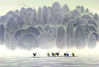 此外,我们能在蒋博的《冰之舞》、刘钻的《彩云之处五洲同》等中国画作品中欣赏运动员的优美身姿;能在池颖红的《冰雪情》、刘吉弟的《冬韵》等油画作品里领略雄浑壮阔的冬日之景;还能在沙永汇的《追球》、王僖山的《铁马冰河》等版画作品中感受到团队协作的凝聚力。