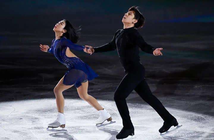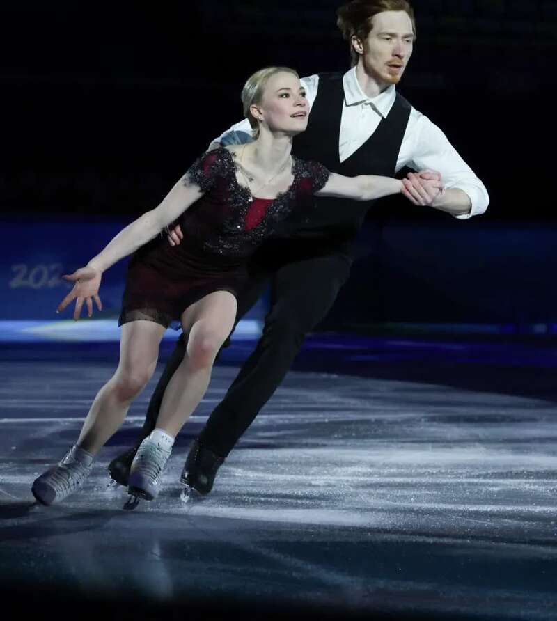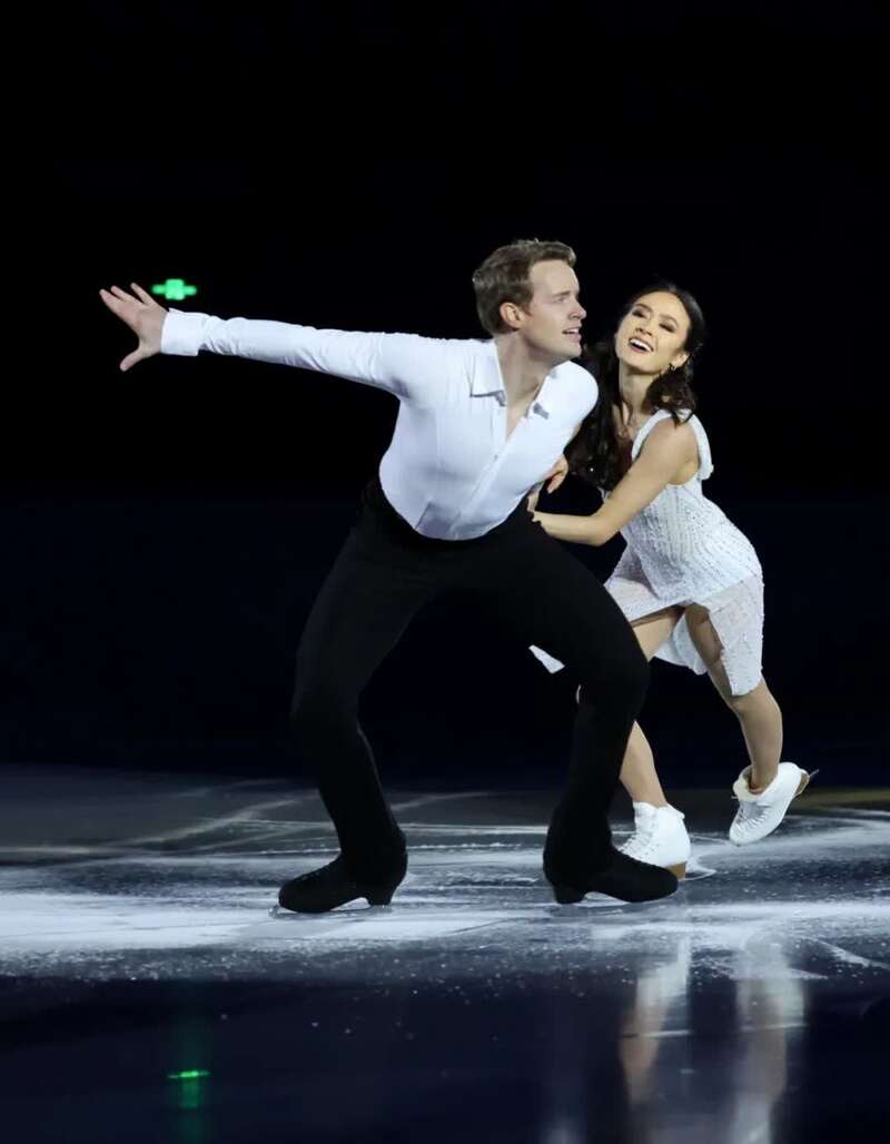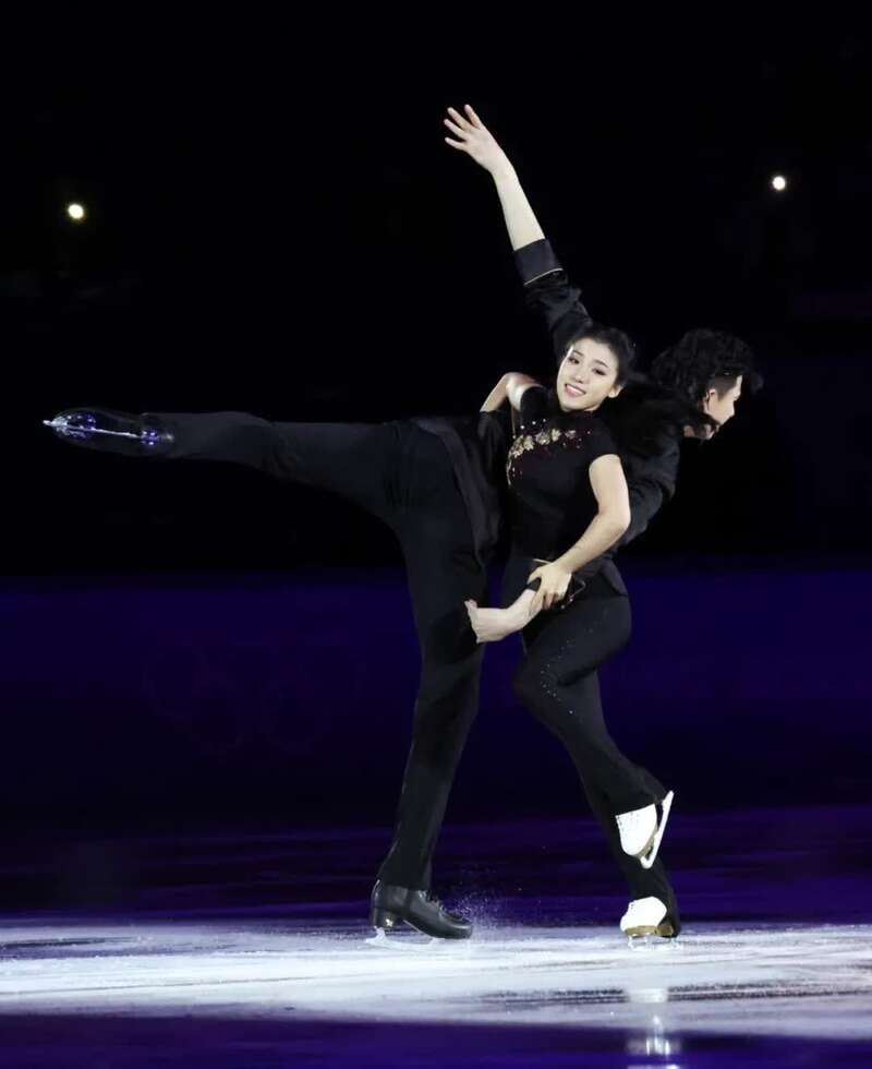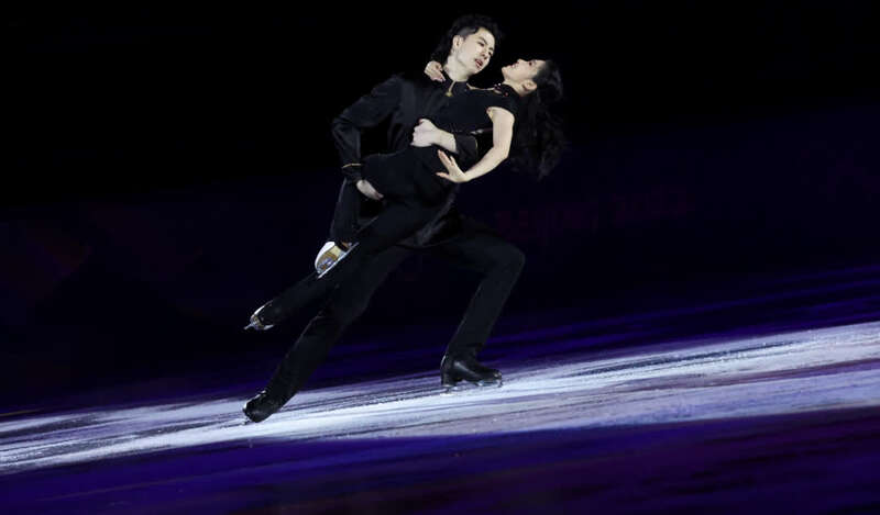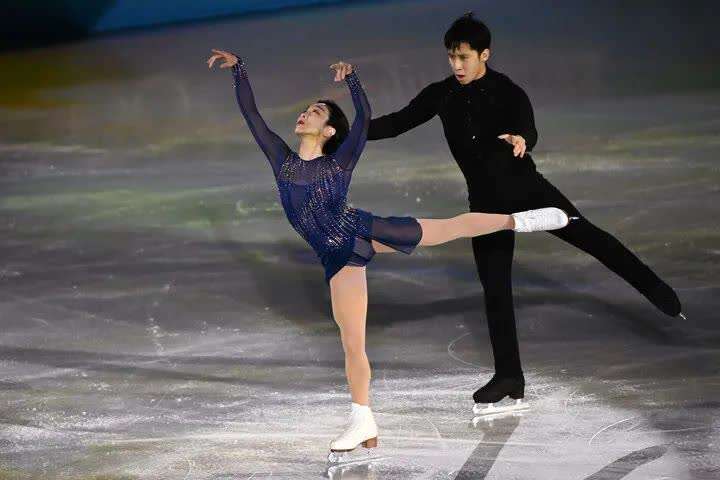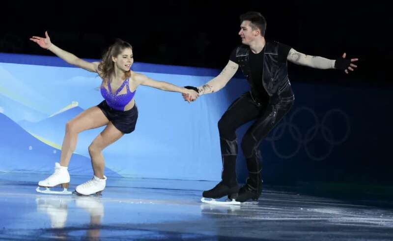 2月20日,俄罗斯奥委会选手阿纳斯塔西娅·米希娜(左)和亚历山大·加利亚莫夫在表演滑中。新华社记者 张玉薇 摄