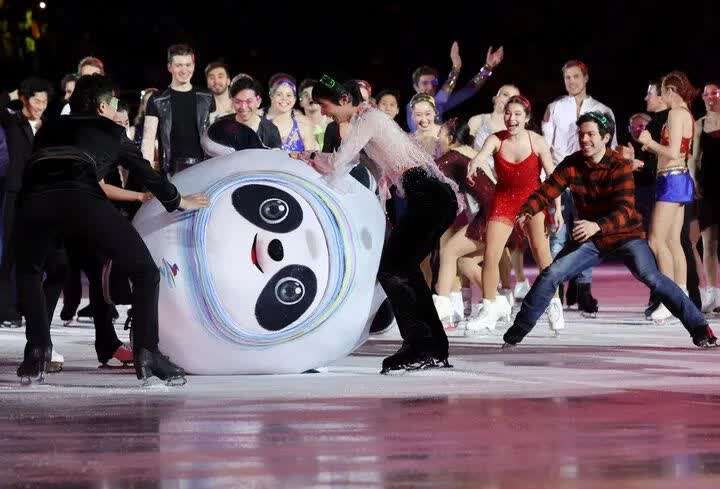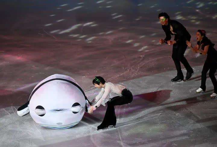 2月20日,日本选手羽生结弦(左二)在表演滑结束后扶起摔倒的“冰墩墩”。新华社记者 李尕 摄