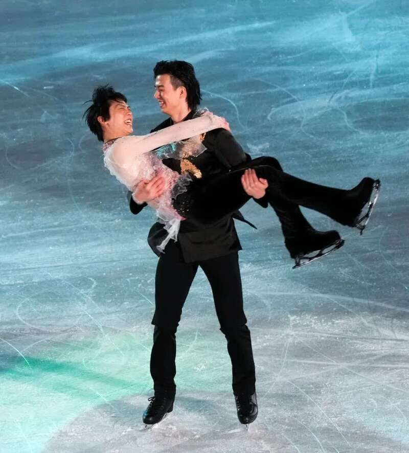 2月20日,中国选手柳鑫宇(右)在表演滑结束后抱起日本选手羽生结弦。新华社记者 王毓国 摄