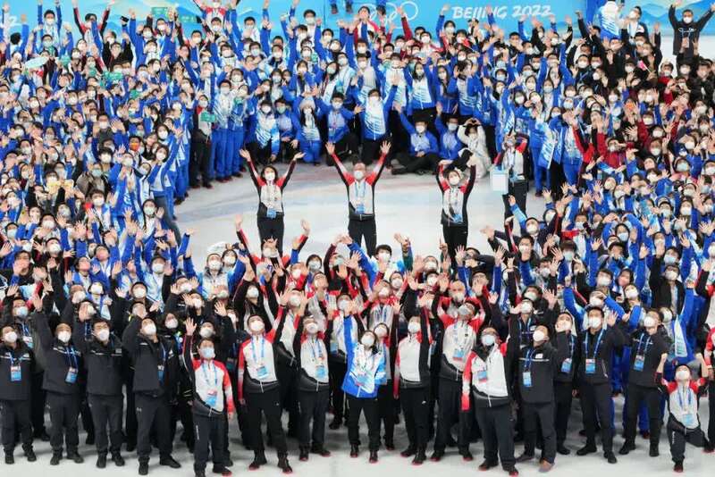 2月20日,工作人员和志愿者在表演滑结束后合影留念。新华社记者 王毓国 摄
