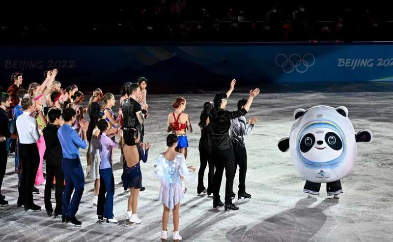 2月20日,选手们在表演滑结束后与“冰墩墩”互动。新华社记者 张玉薇 摄