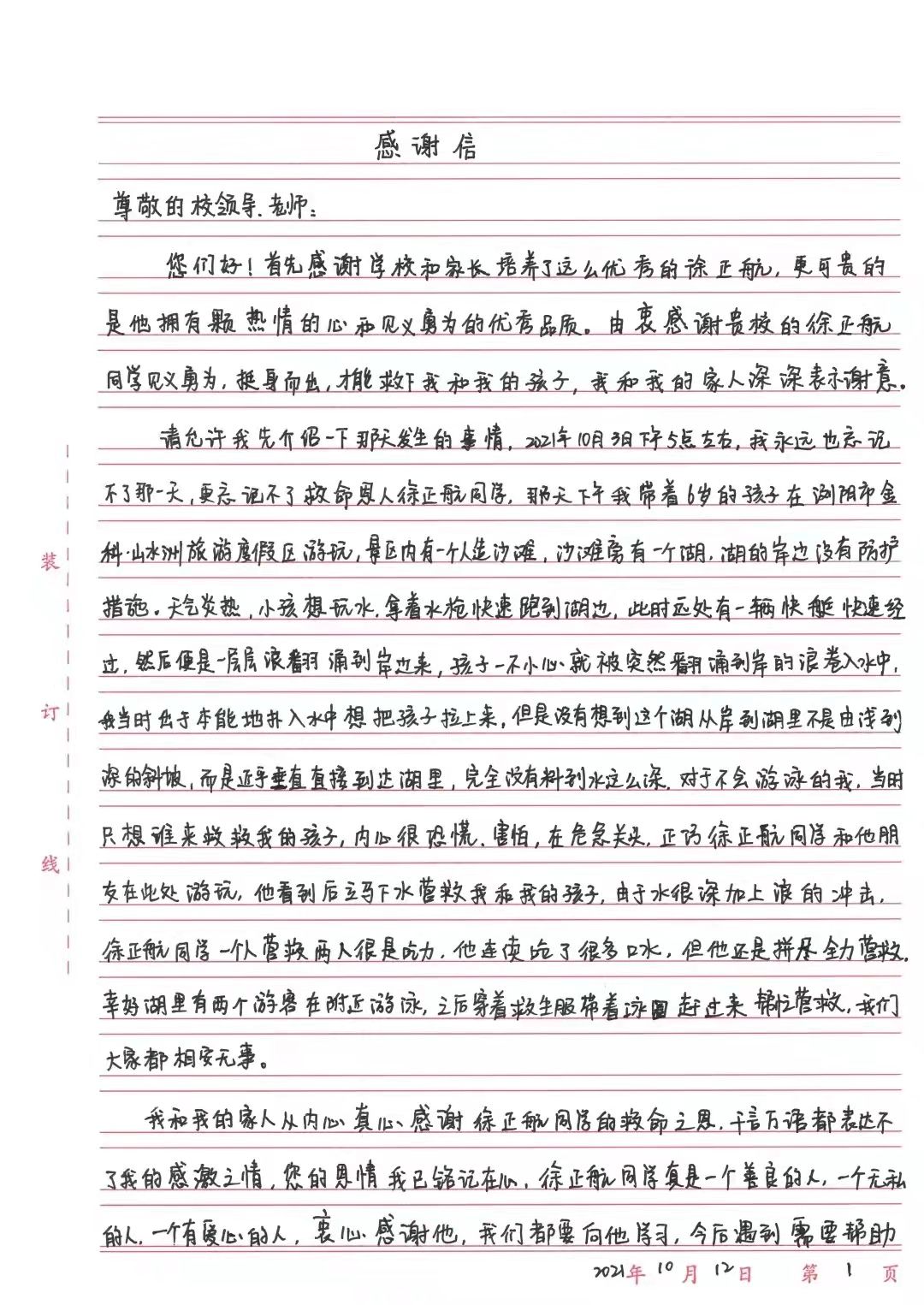 国庆假期后,卢女士联系到中国农业大学,将一封感谢信送到了学校。信中写到,“由衷感谢贵校的徐正航同学见义勇为,挺身而出,才能救下我和我的孩子,我和我的家人深深表示谢意。”