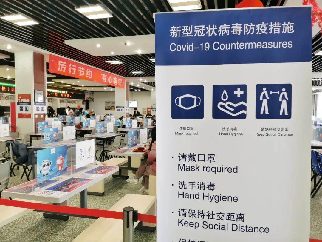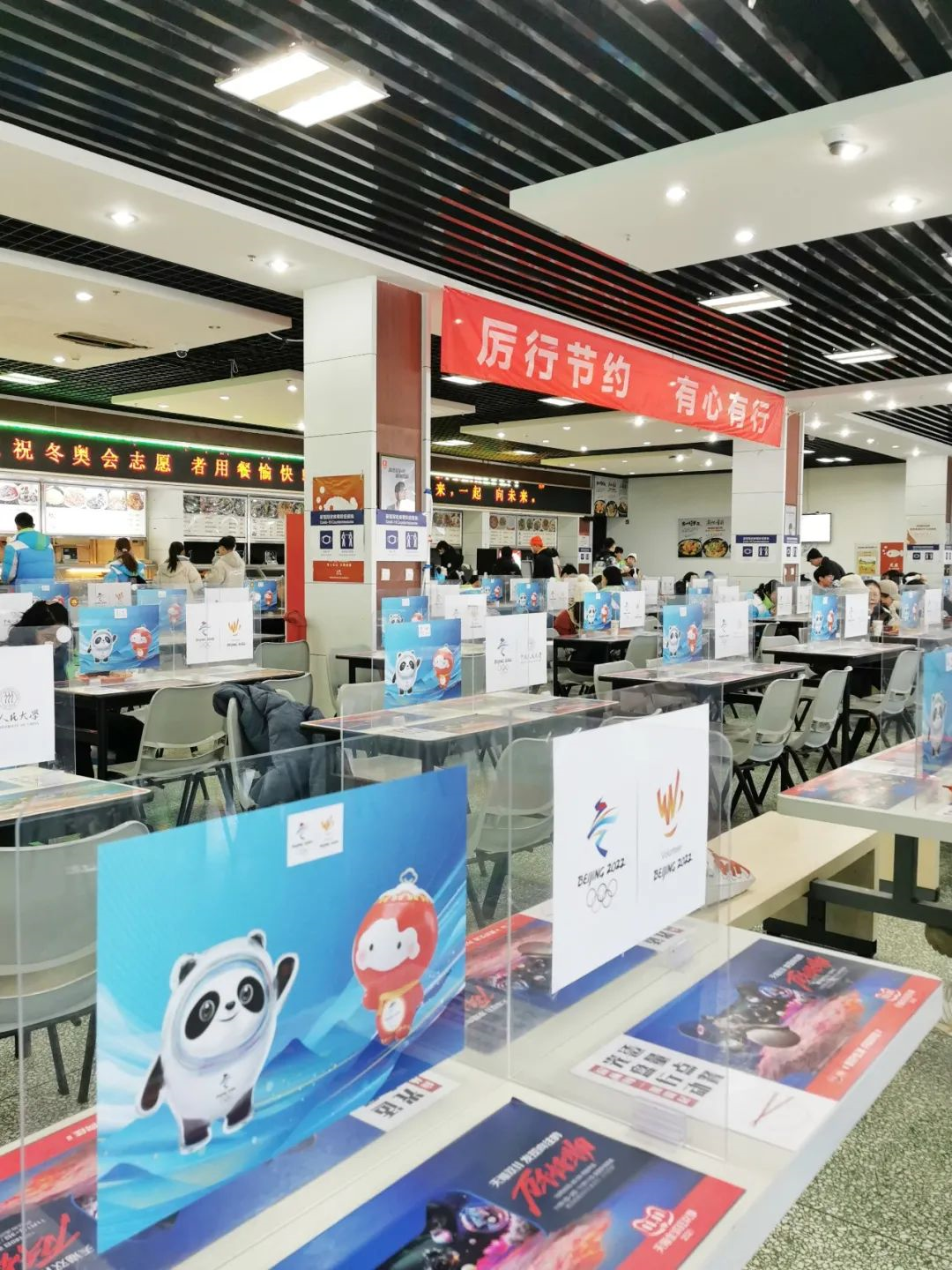 “中区食堂全体员工祝冬奥会志愿者用餐愉快!让我们携起手来,一起向未来!”走入中区食堂二楼,随处可见的冬奥元素填满了食堂的各个角落,为了打造驻地“家一般的温暖”,后勤餐饮保障团队可谓是下足了功夫。