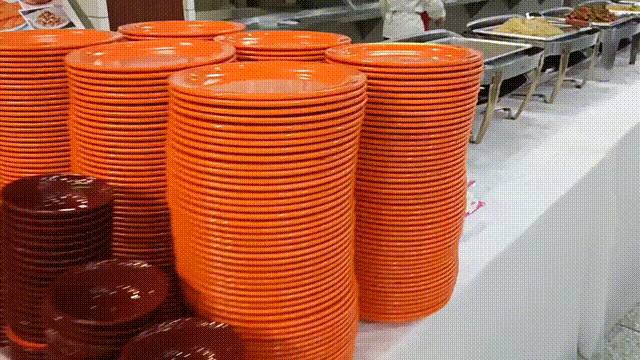 李阿姨说她的职责就是“保障大家都能吃到想吃的”。用餐时段,她会和另一位同事一起在餐台附近监控菜品余量,当菜量不足或过量时,通过对讲机把实时情况反馈给后厨。两台饮料机,八种热饮,自食堂开餐以来便颇得志愿者们的好评,饮粉的添加和桶装水的补充,都由李阿姨一人负责,“志愿者们最爱喝的是椰奶、紫薯和红豆”,因为每次都是这几款最先见底。机器旁一个个整齐的纸杯,也是她亲手摞起来的,只是为了避免一叠纸杯摆在那“志愿者有的时候想拿一个但拿不出来”的不便。
