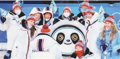2月14日,参加北京冬奥会的运动员在颁奖广场与“冰墩墩”合影。新华社记者 丁 汀摄
