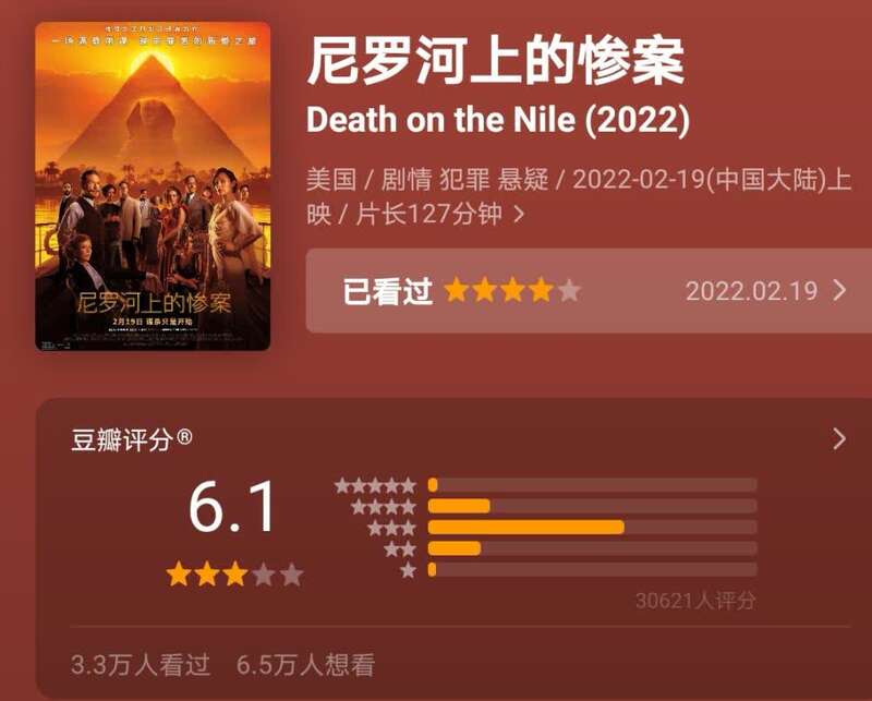 不过,不管是否看过以上版本,对新版《尼罗河上的惨案》的观影体验影响并不大——大家打着呵欠走出影院时,几乎众口一词地打出差评。知道凶手的人没能从添油加醋的故事中获得新乐趣,不知道的人也被草率的悬疑处理降低了破案的爽感。有人觉得,该片问题出在铺垫太长,缺少反转,“剧本杀时代,还不如去看《明星大侦探》”。