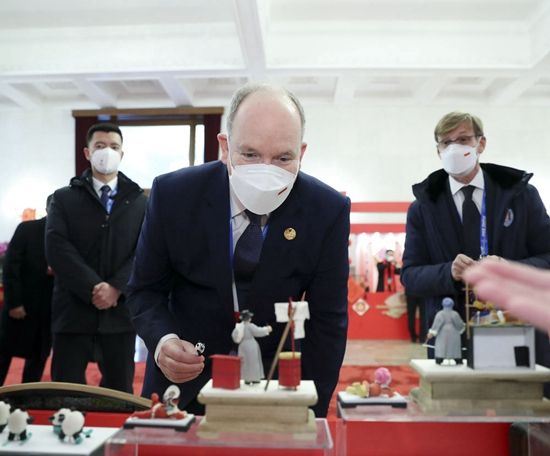 摩纳哥元首阿尔贝二世亲王被“冰墩墩”面塑所吸引