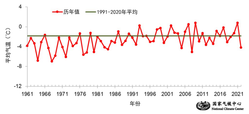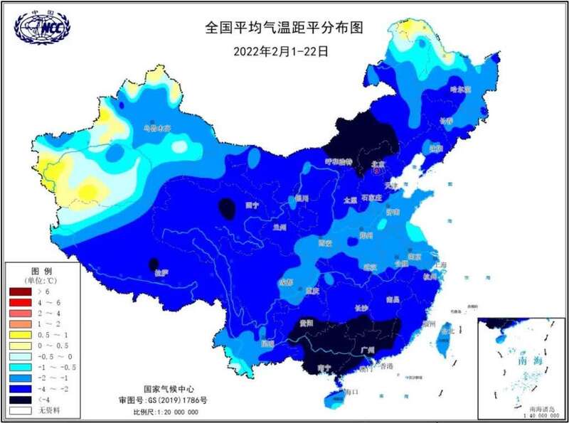 2月以来(2月1日至22日),全国平均气温-4.2℃,较常年同期偏低2.3℃,为2009年以来历史同期最冷。