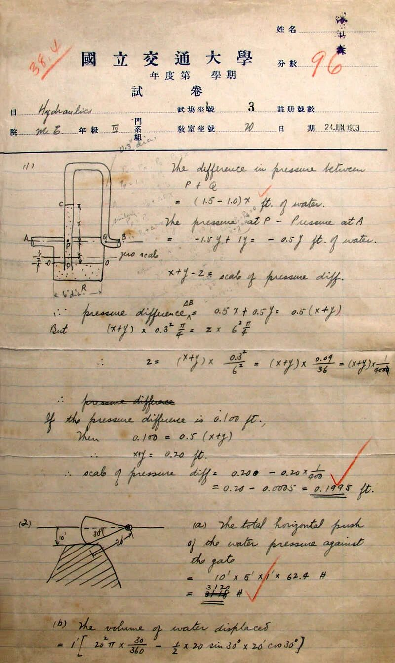 钱学森 参加水力学考试的试卷
