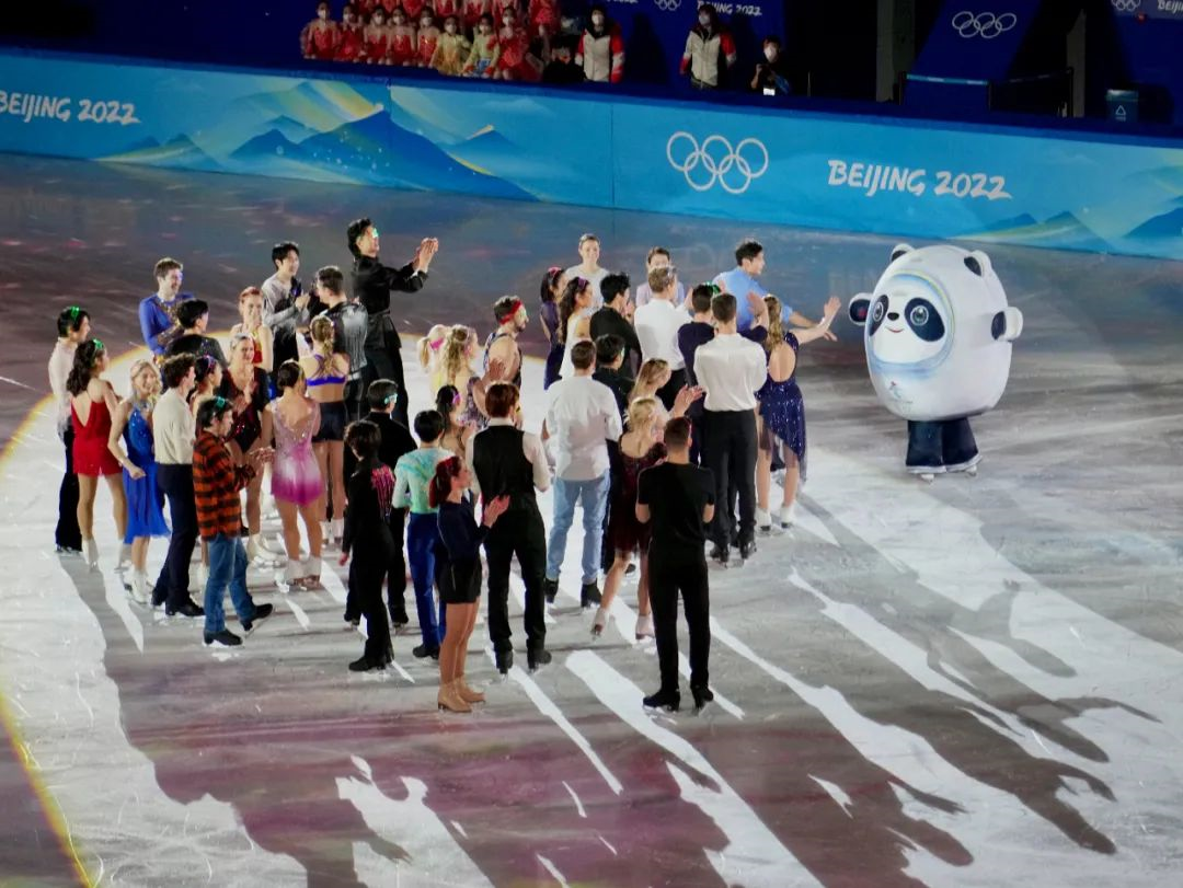 2月20日,花样滑冰表演赛结束后,运动员们与冰墩墩互动。光明日报全媒体记者郭红松 摄