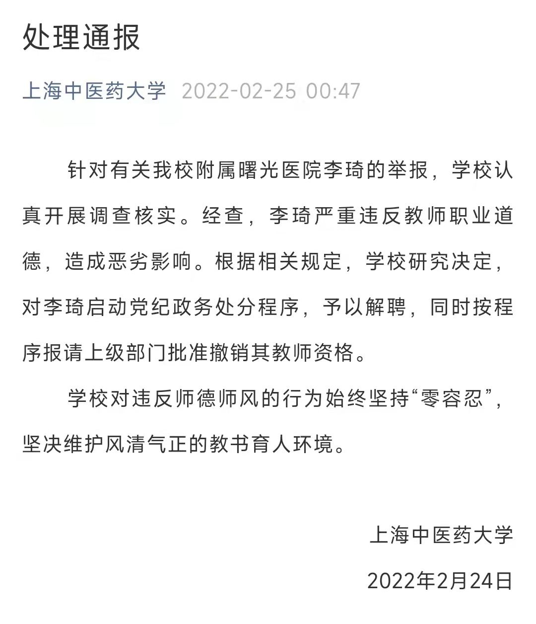 在舆论质疑声中,上海中医药大学发布处理通报:“针对有关我校附属曙光医院李琦的举报,学校认真开展调查核实。经查,李琦严重违反教师职业道德,造成恶劣影响。根据相关规定,学校研究决定,对李琦启动党纪政务处分程序,予以解聘,同时按程序报请上级部门批准撤销其教师资格。”