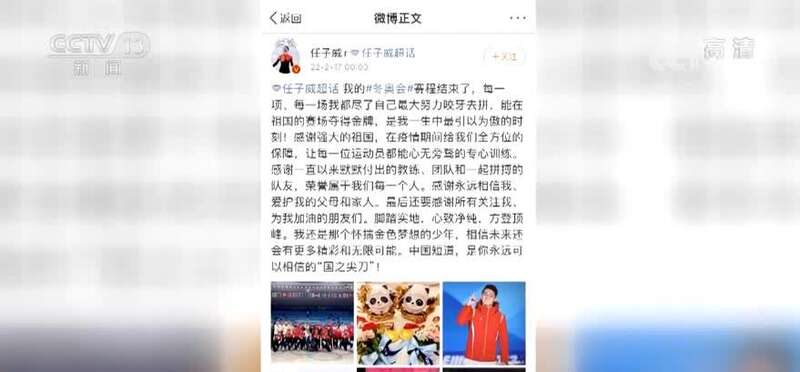 2月17日,任子威在社交媒体(微博)上写道:“我的冬奥会赛程结束了,每一项、每一场我都尽了自己最大努力咬牙去拼,能在祖国的赛场夺得金牌,是我一生中最引以为傲的时刻!中国短道,是你永远可以相信的“国之尖刀””!