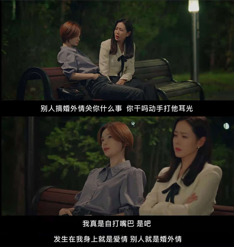 一改《机智的医生生活》中爽朗的医生形象,田美都饰演的灿荣,是一个遇到感情犹豫不决,明明跟已有妻儿的前男友金振锡(李茂生 饰)纠缠不清,却一直强调自己在男方婚后没有跟他上床,所以即使日常看电影、约会,也不算小三的角色。甚至在街头遇到陌生的夫妻因为出轨吵架,灿荣还会上前去殴打男方,打到进了警察局;然后又埋头懊恼,自己为何如此双标……既拧巴又令人心疼。