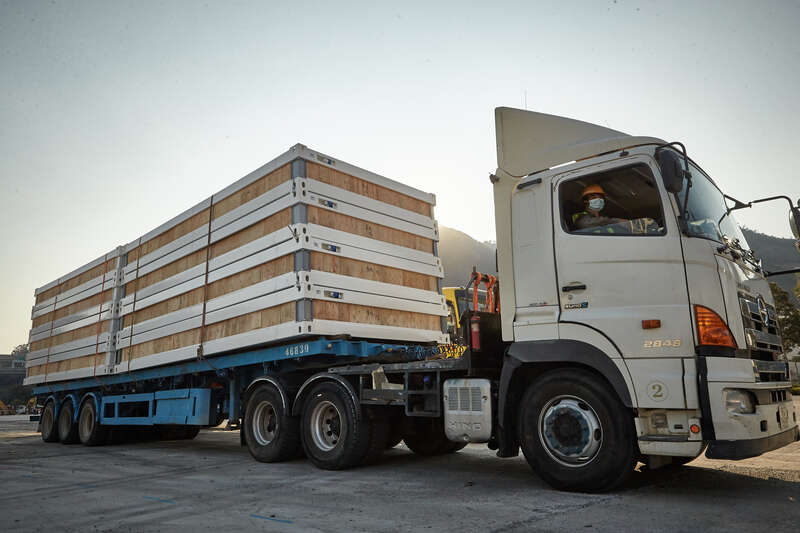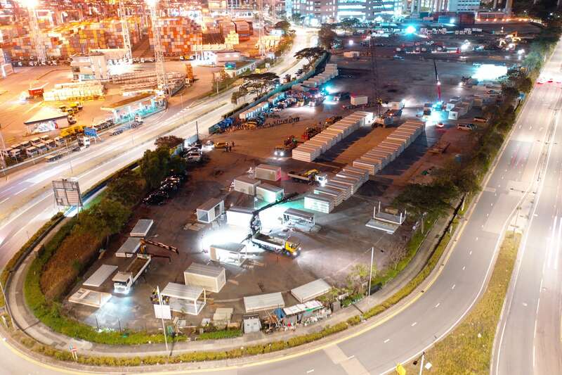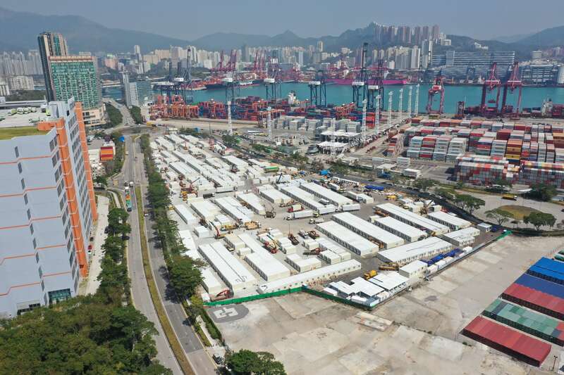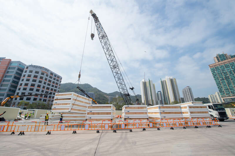 2月24日,经过连日阴雨天,香港天气放晴。在青衣项目的工地上,陆续送抵的隔离箱体。