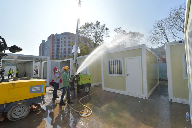 2月25日,青衣方舱医院项目现场,工作人员正在给隔离箱进行试水。