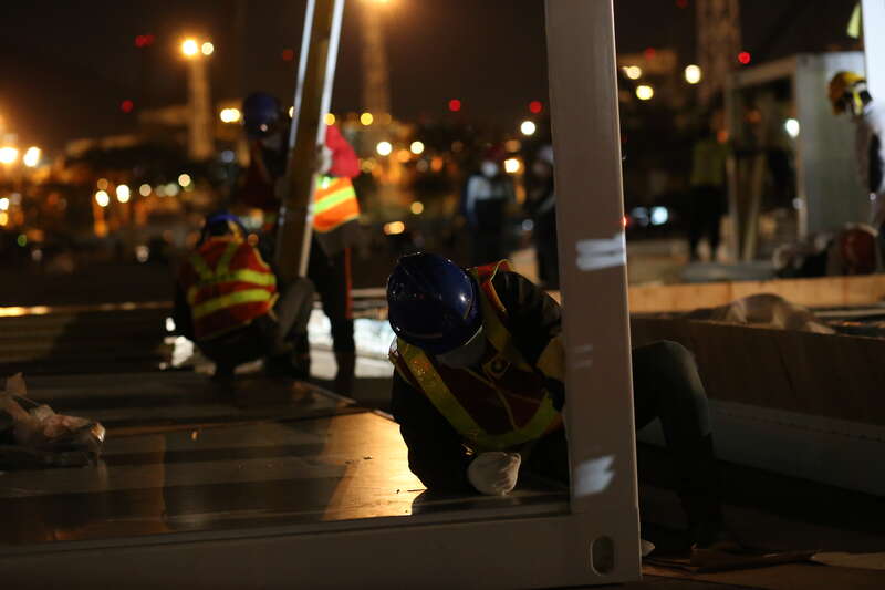 2月23日夜间,工人们正连夜进行设施安装。