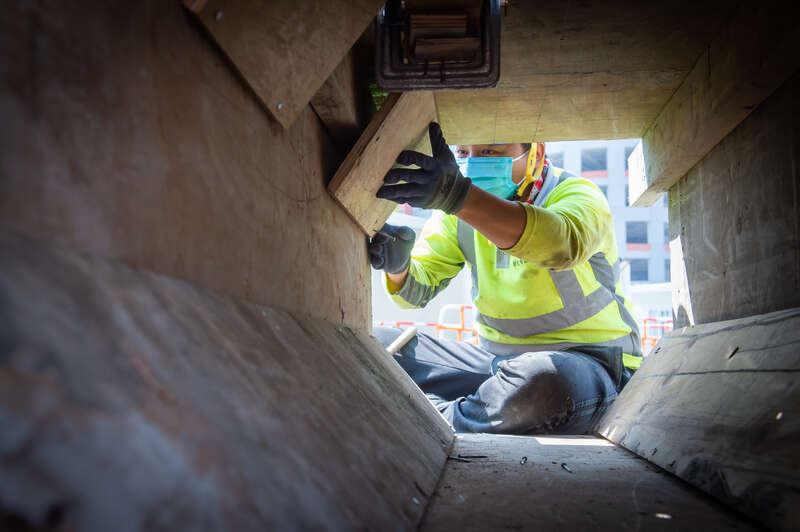 2月26日,在青衣项目现场,施工人员正在进行钉板。