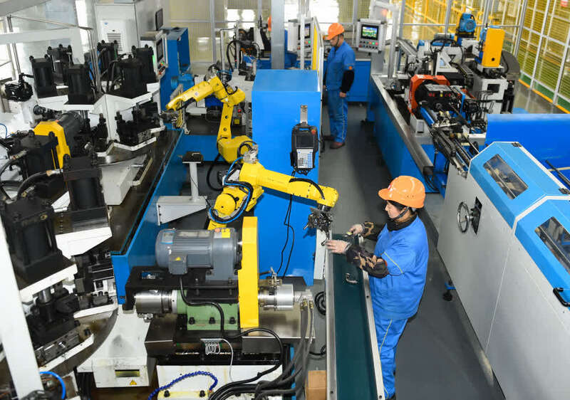 2月14日,在位于浙江省湖州市吴兴区的金洲管道科技股份有限公司,工作人员和智能机器人协作生产不锈钢管件。新华社记者 翁忻旸 摄