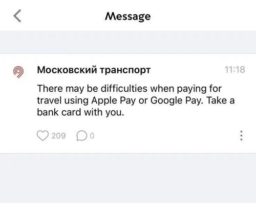 还有在莫斯科旅行的人士今日收到一条来自“莫斯科交通”的短信通知,称近日使用苹果和谷歌的支付系统可能存在困难,建议收到通知者随身携带银行卡出行。