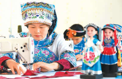 贵阳市南明区永乐乡羊角村村民正在为文创产品——少数民族娃娃制作服饰。赵 松摄(人民图片)