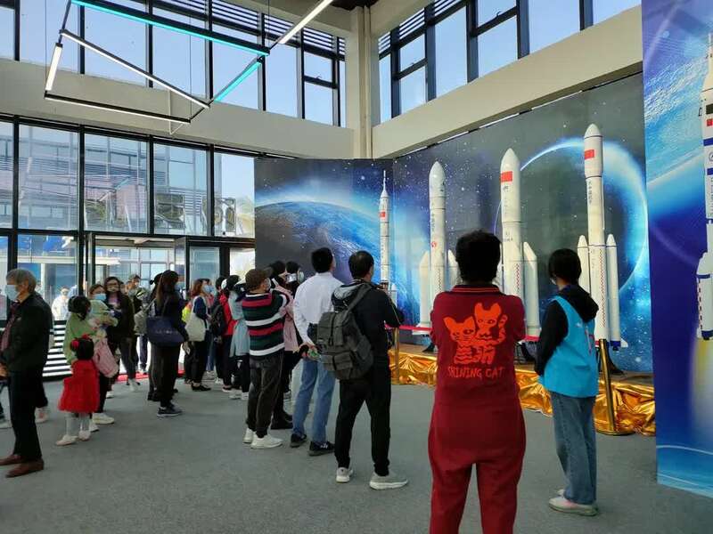 “青航星”志愿者在航天科普中心为游客讲解我国航天发展史,以及介绍执行本次发射任务的长征八号遥二运载火箭。