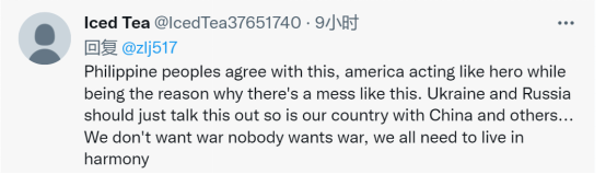 “菲律宾人同意这一点,美国表现得像个英雄,却是造成这种混乱的原因。乌克兰和俄罗斯应该讨论这个问题,我们国家也应该与中国和其他国家讨论这个问题……我们不想要战争,没人想要战争,我们都需要和睦地生活。”