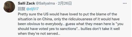 “我敢肯定,美国很乐意把责任推到中国身上,大家都知道这是多么荒谬。猜一下,他们说‘你应该对制裁投赞成票’是什么意思……恶霸达不到目的是不会罢休的。”