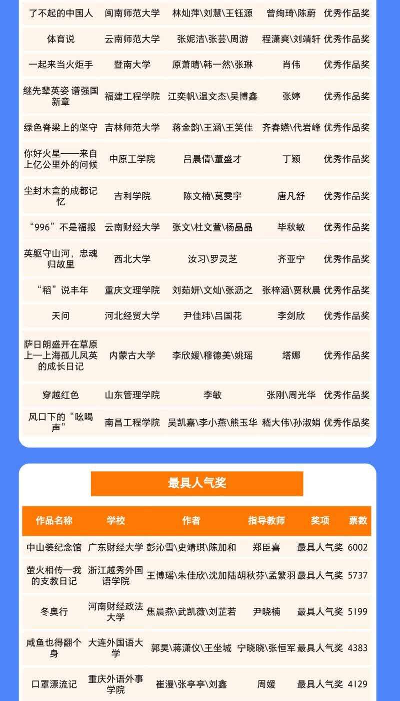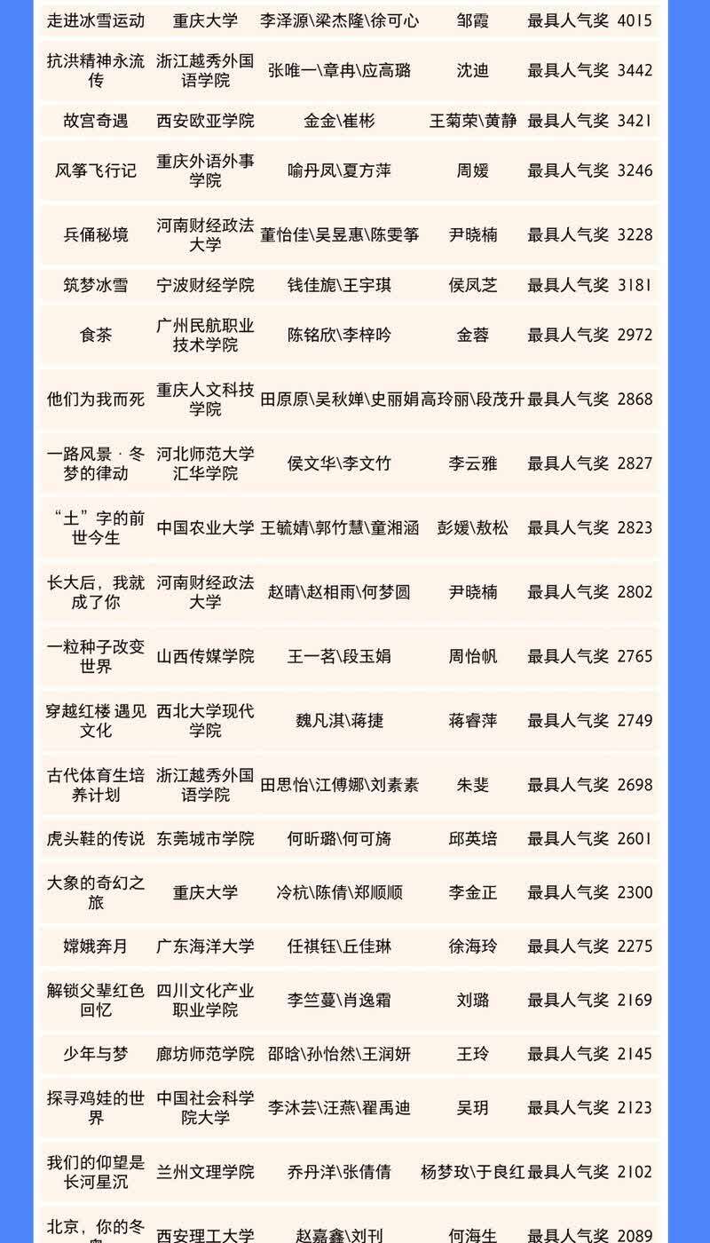 本届大赛自开赛以来,受到全国各地高校师生的广泛关注,主办方也向全国高校提供各类大赛宣讲及培训活动支持参赛,比赛累计收到122所高校1296余部作品,参赛高校和师生规模又创新高!历时4个月,经过多轮专家评审,120部作品脱颖而出。