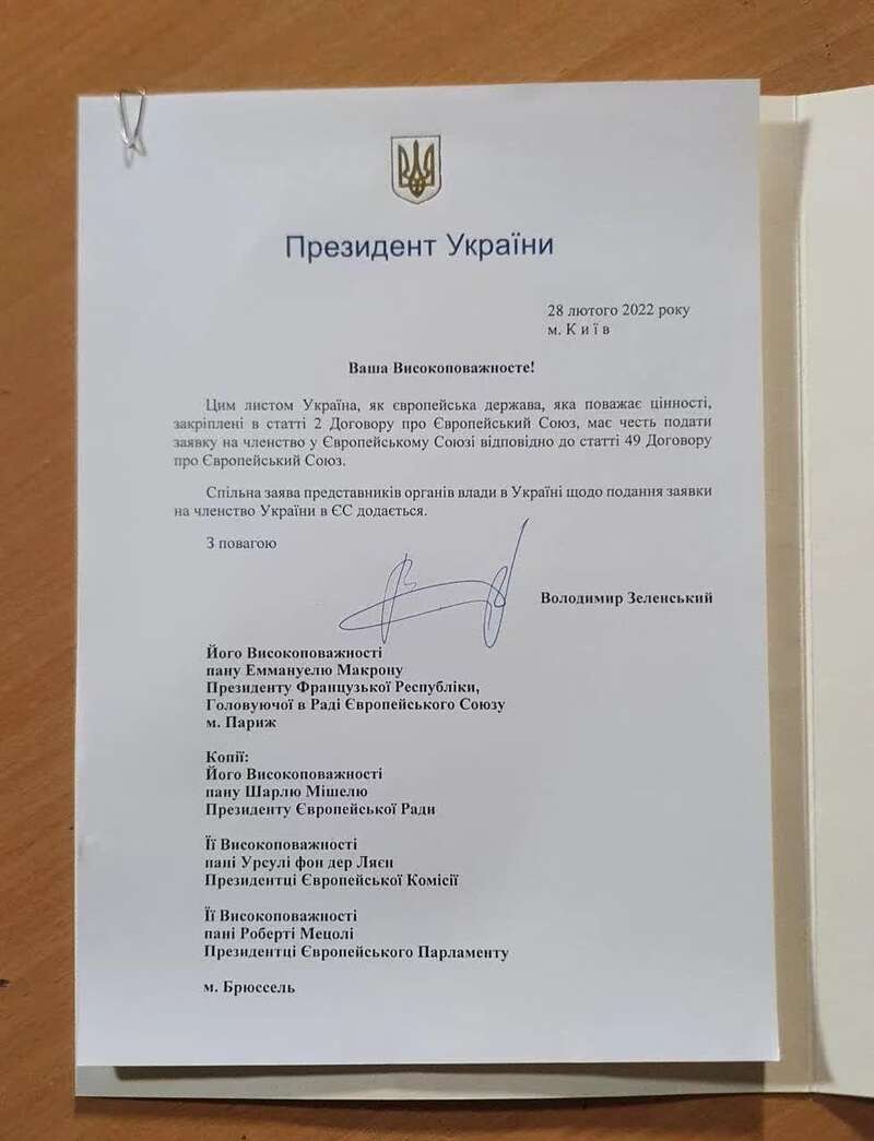 当地时间2月28日,乌克兰总统泽连斯基签署加入欧盟的正式申请文件。