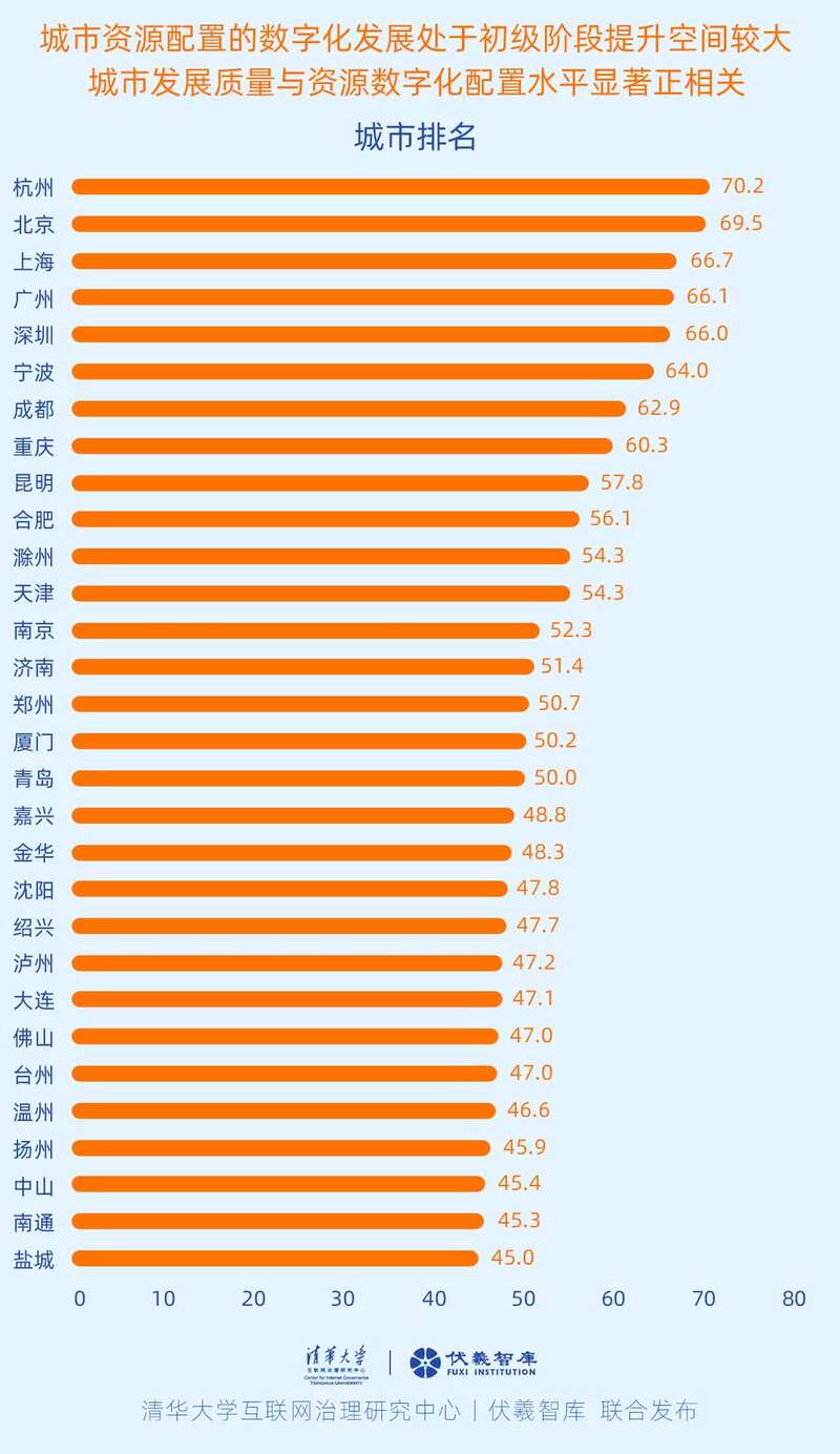 中国青年报客户端讯 (中青报·中青网 记者 王亦君)清华大学互联网治理研究中心、伏羲智库日前联合发布国内首份《中国城市资源数字化配置指数研究报告》(以下简称报告)。报告指出,数字化是数字经济时代城市资源配置的最优手段,但全国城市资源配置的数字化发展水平还处于初级阶段,评估中仅有杭州、北京、上海、广州、深圳、宁波、成都和重庆等8个城市超60分,整体还有较大提升空间,建议完善政策法规,支持和鼓励城市资源数字化配置市场化服务。